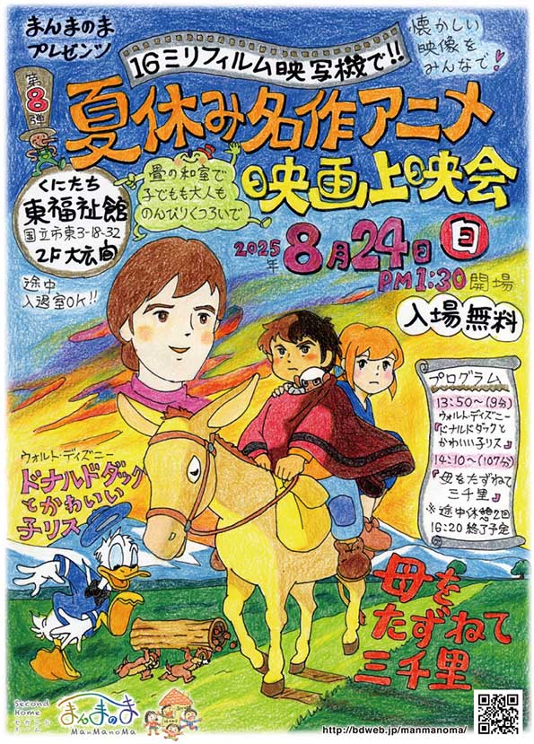 2025年8月21日(日)に国立市・東福祉館・2階の大広間にて予約不要・入場無料で開催しました。ウォルト・ディズニー『ドナルドダックとかわいい子リス』ほか同シリーズ2作も試写を行い、長編アニメ『母をたずねて三千里』を上映しました。20名余りの大人から親子連れまで新しい来場者にもご来場いただきました。また上映希望の作品もぜひご要望あれば連絡をください。